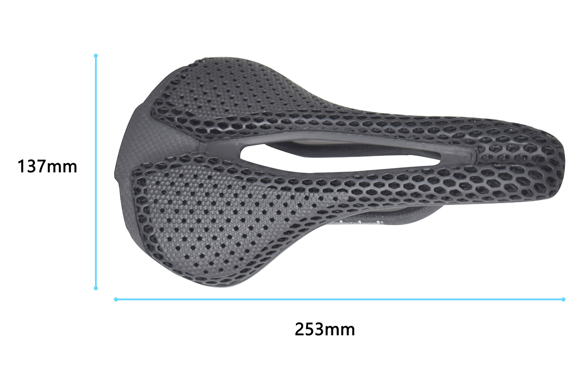 This high-performance saddle combines 3D-printed cushioning with a lightweight carbon fiber base. It offers excellent shock absorption, breathability, and ergonomic support to reduce pressure during long rides. Ultra-light, durable, and designed for road, mountain, and gravel cycling, it delivers superior comfort and efficiency for every rider.
