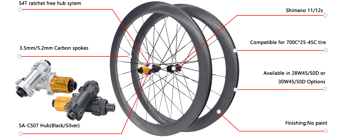 | SA45CT-30 | 45mm | 45mm | Tubeless | 12*100mm | 12*142mm | 3.5/5.2mm carbon spoke | 20H/20H | 1336g(3.5mm spoke) |