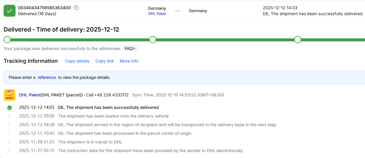 ⇒Se le informazioni di tracciamento logistico vengono aggiornate, significa che il pacco ha completato lo sdoganamento in Germania o nei Paesi Bassi e verrà solitamente consegnato entro 5 giorni lavorativi.
